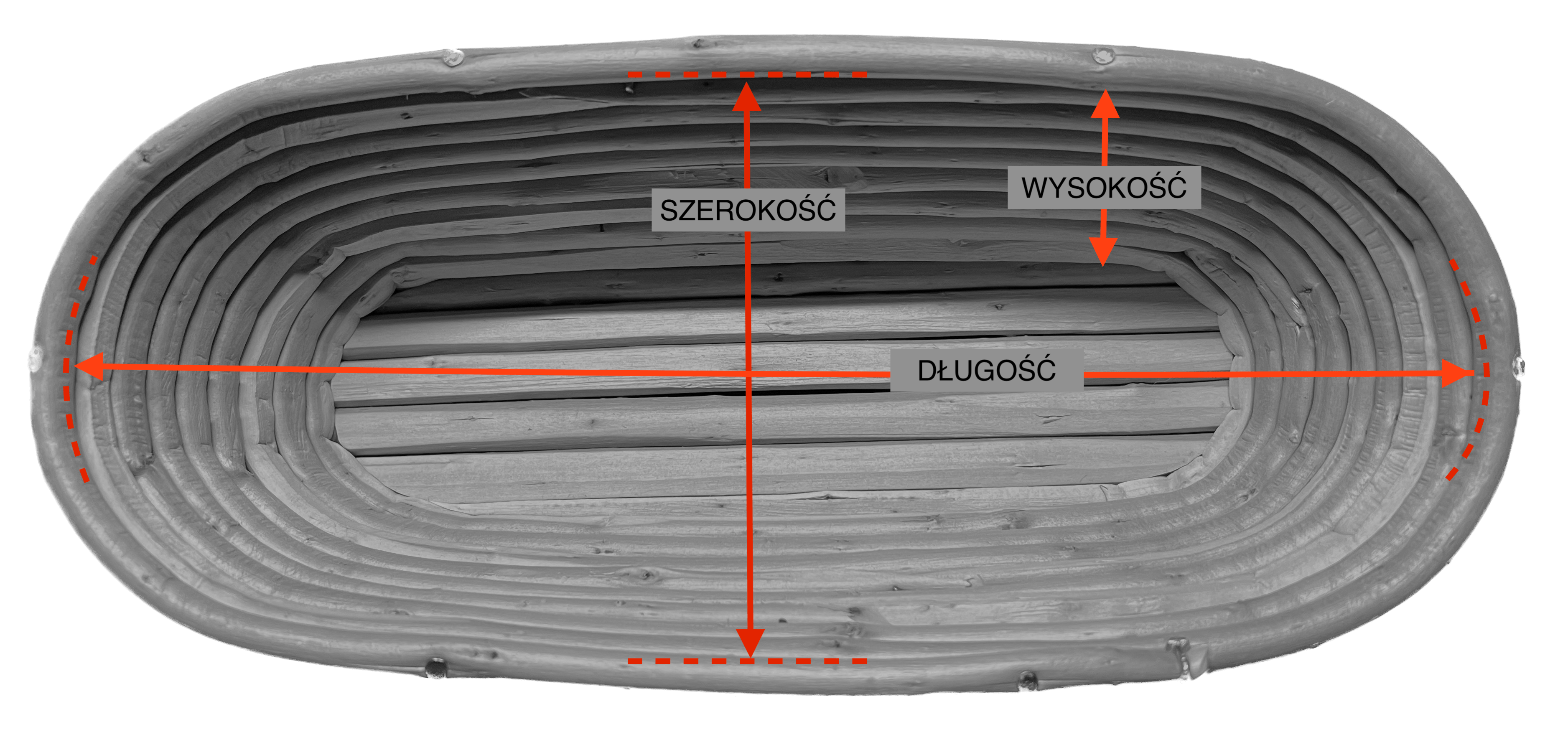 Koszyki mierzymy w sposób podany na przykładowym obrazku. Do wymiarów bierzmy wewnętrzne strony koszyka. Tak mierząc zawsze mamy podany wymiar, który mieści daną pojemność ciasta.